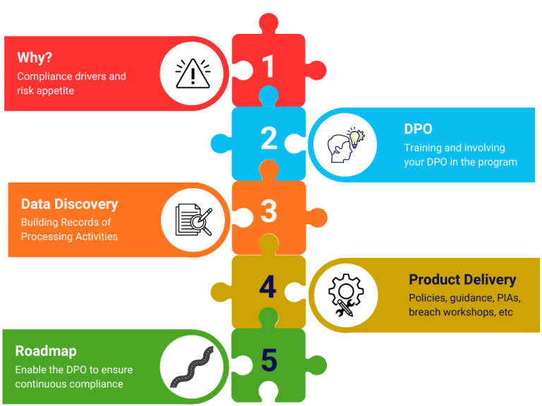 We ask you to nominate someone as DPO. We take that person, train them, then deliver the program with them, mentoring and upskilling them so that they can take our roadmap and ensure continuous compliance.